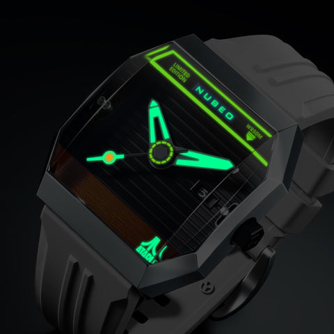 Japanese automatic movement powers this collector’s piece, visible through a detailed exhibition caseback. Luminous hands bring the console-inspired design to life, even in the dark.