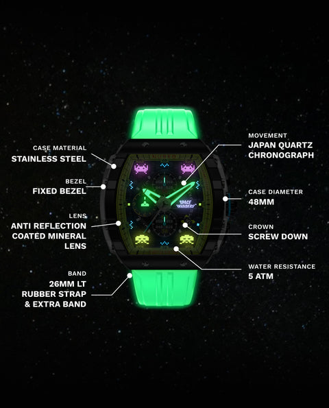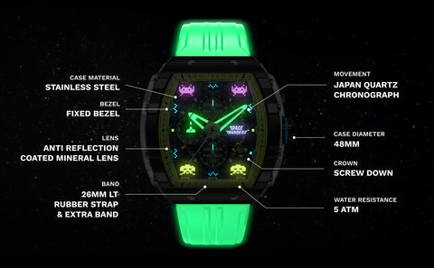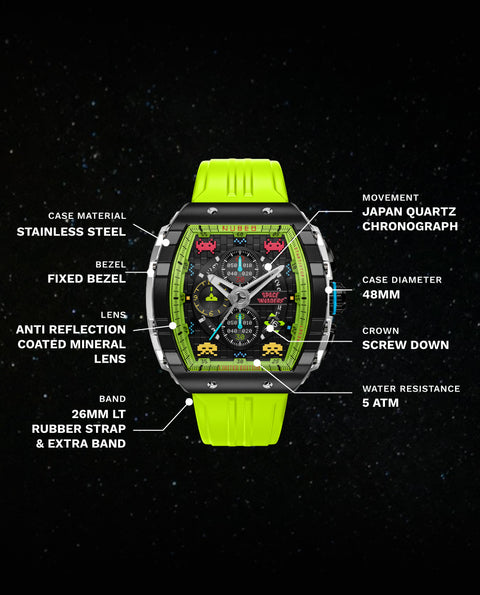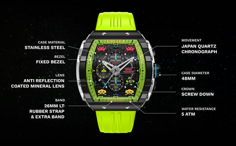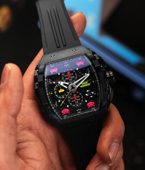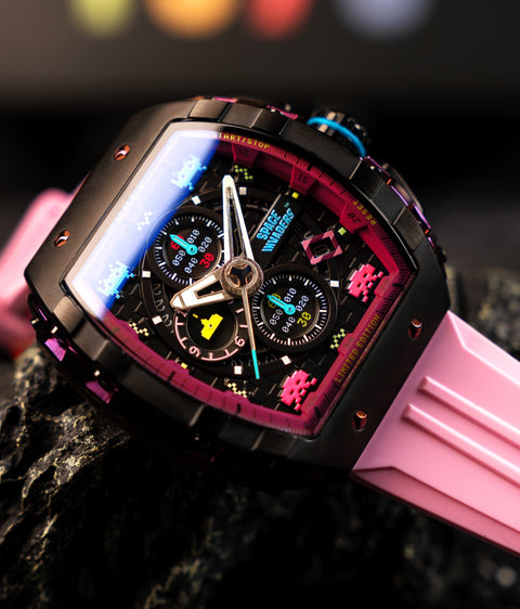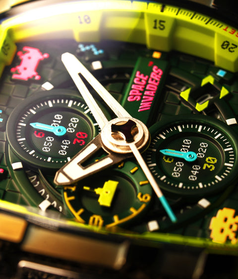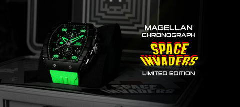Step into the arcade era with the Magellan Chronograph Space Invaders Limited Edition. Featuring custom-molded aliens on the dial and a laser cannon-inspired subdial hand, this timepiece bridges the gap between gaming nostalgia and cutting-edge watch design.