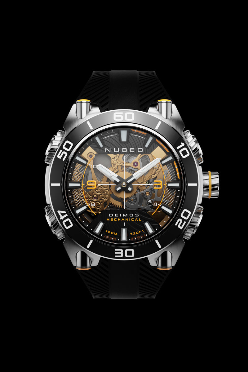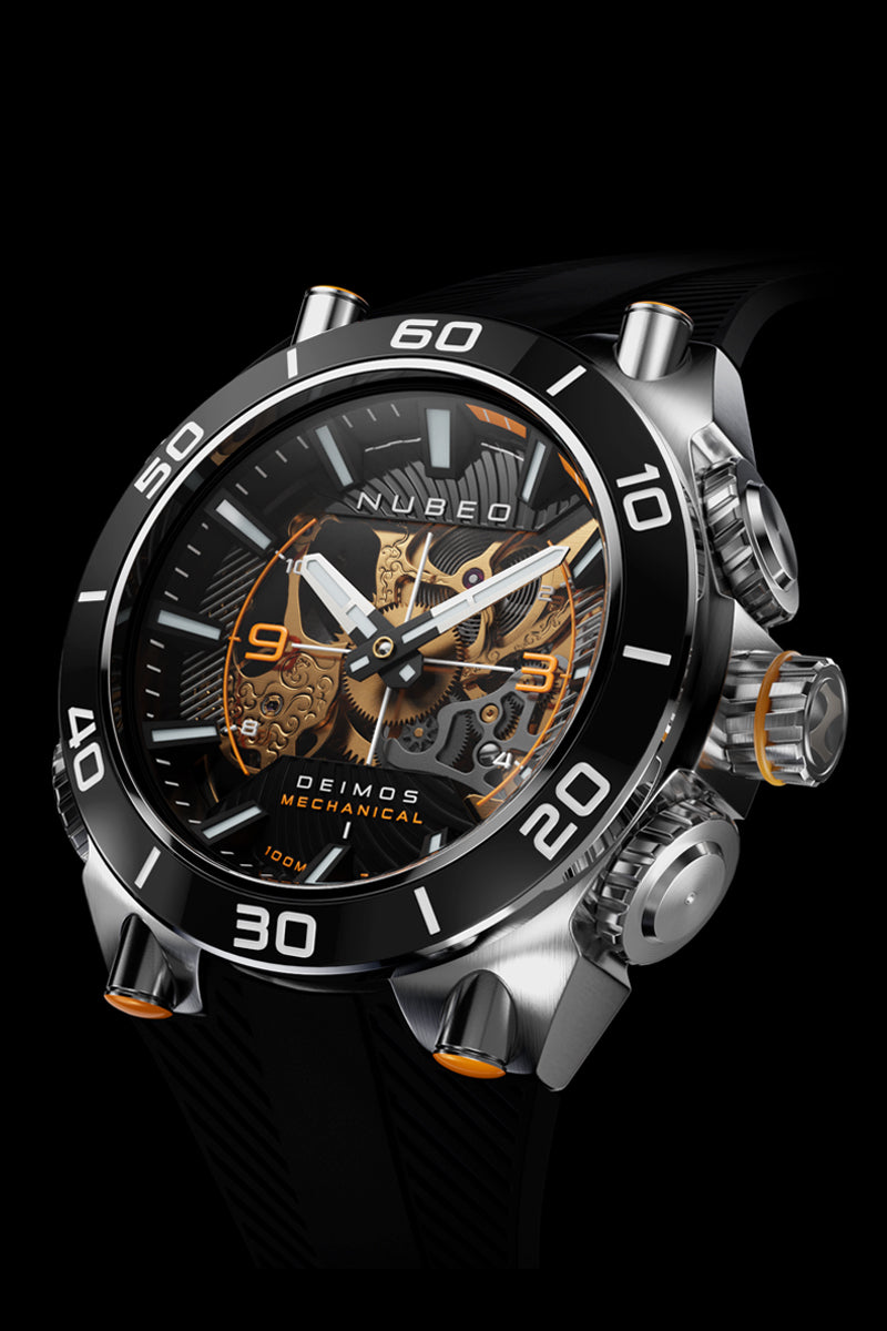 Juxtaposing the traditional with a modern form, the Deimos is available in a hand-wound, mechanical execution. This execution shows off the jigsaw of gears and wheels that are built into the elaborate skeletonised movements within the space age rocket-inspired case. Unexpected, beautiful, captivating, and a testament to Nubeo design.