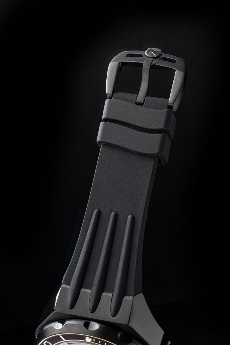 The Mariana is imposing and obvious, yet finely tuned to be effortlessly wearable. Solid and robust, the carefully crafted watch leans on lines from organisms that withstand the immense pressure of the deepest known part of the oceans. As a dive watch, it performs effortlessly, exhibiting clarity, legibility and impermeability in a design that is explicitly modern and organic in inspiration.